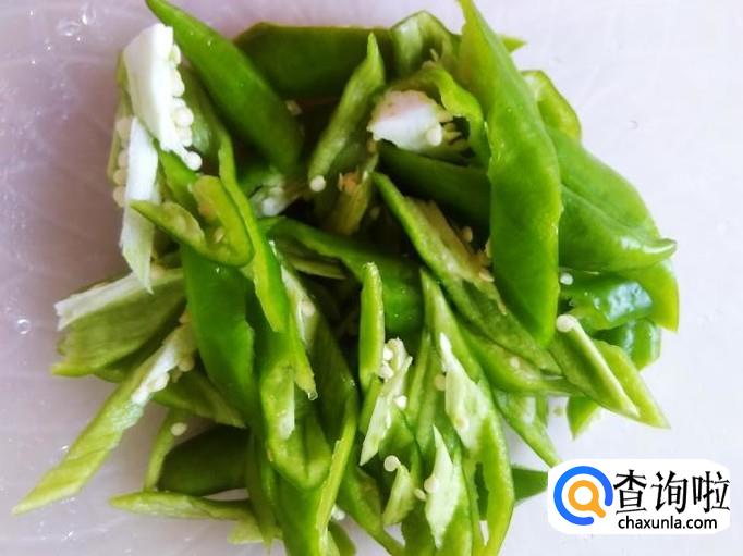 青椒洗干净去籽,然后切成丝。