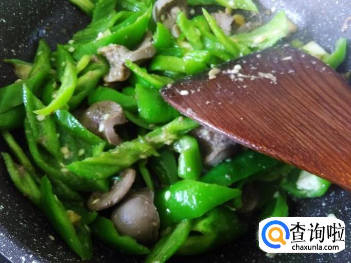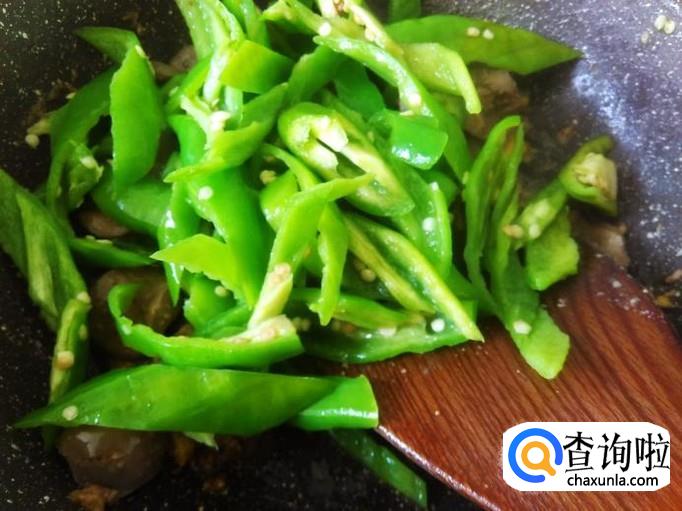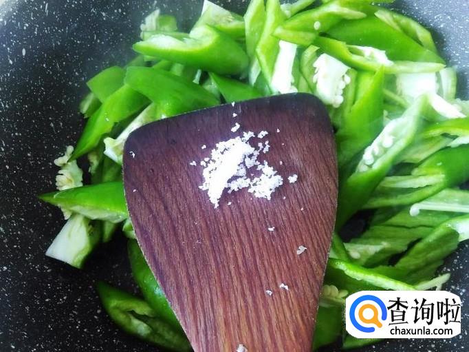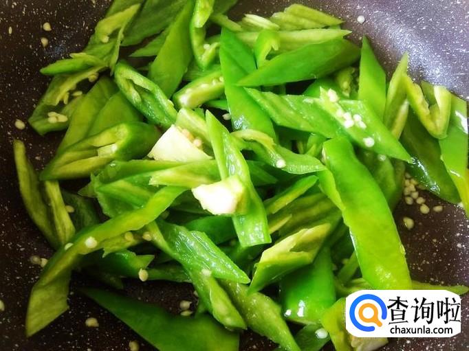 开火下油,放青椒进去,加适量的盐翻炒至软然后铲上碟子。