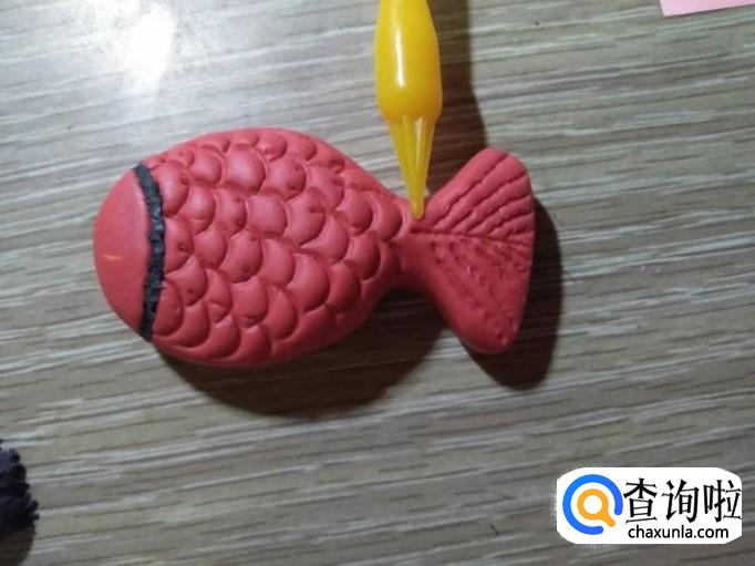 然后在鱼的头部用丸棒轻轻在其头部划一条弧形的沟壑。