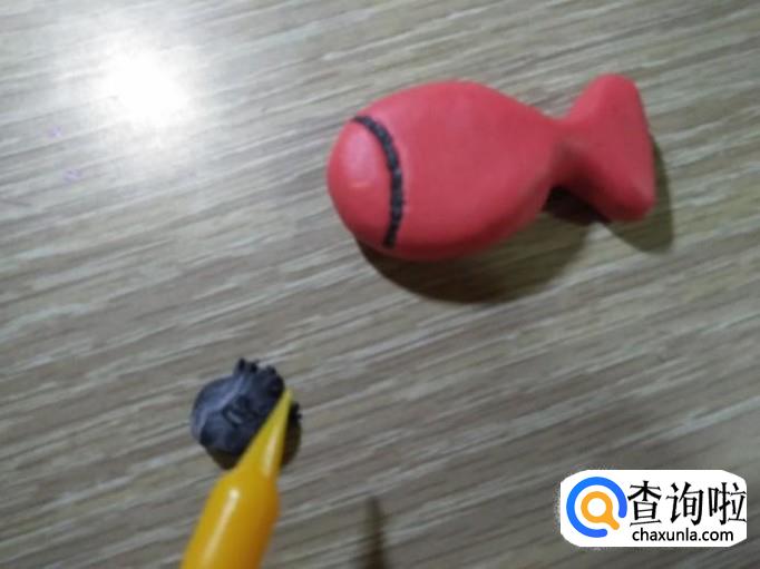 然后用黑色的软陶捏为小圆形使其陷入鱼头部合适的部分,轻轻往下按一下,防止其掉落,作为鱼的眼睛。最后用丸棒在鱼眼睛的下方划一条弧形,作为鱼的嘴。