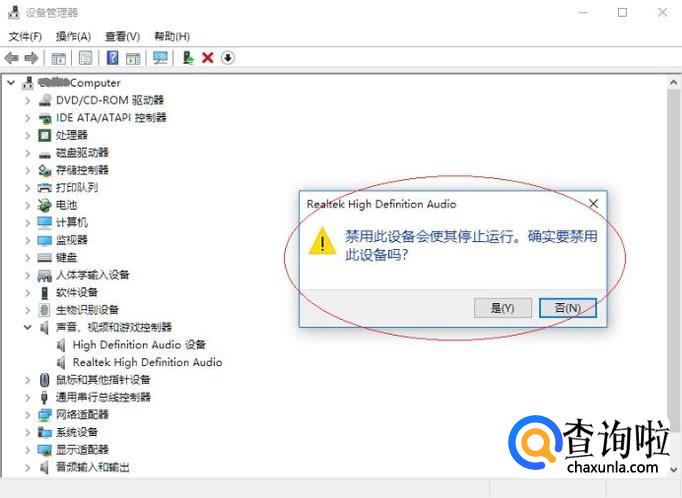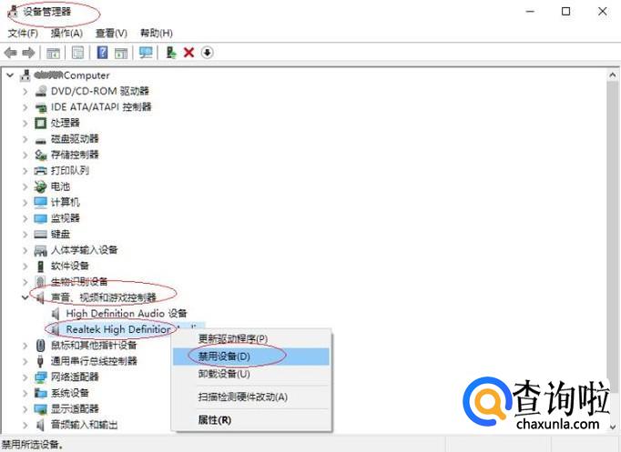 如图所示,鼠标右击"Realtek High Definition Audio"项。弹出快捷菜单,选择"禁用设备"。