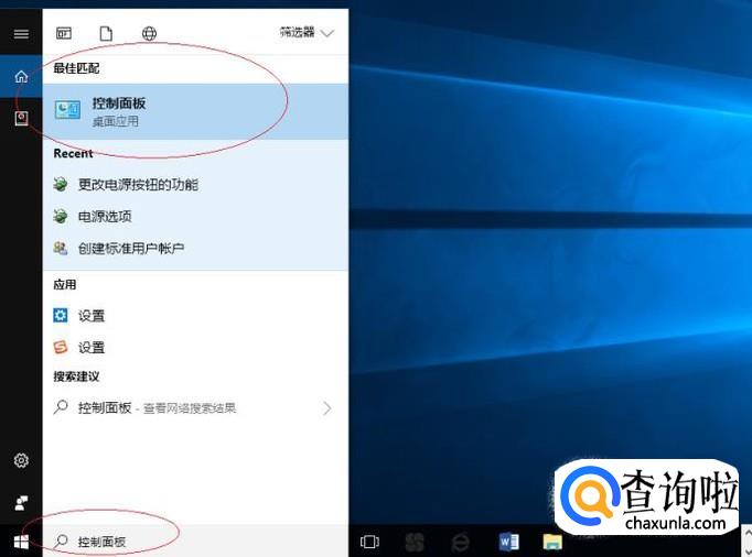 如图所示,搜索框输入"控制面板"。Cortana(小娜)显示搜索结果,点击"最佳匹配→控制面板"项。
