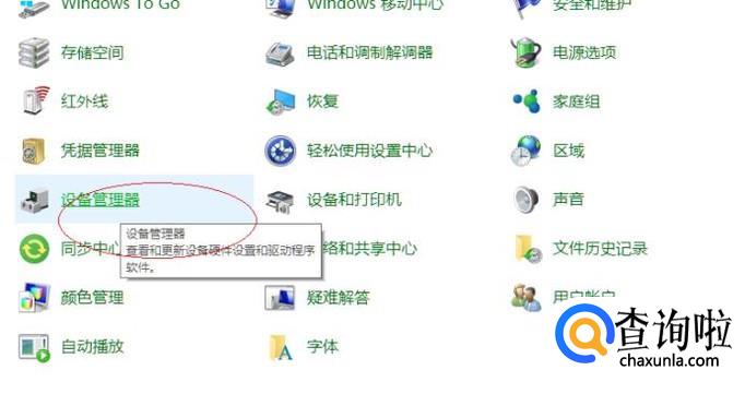 如图所示,显示控制面板所有项目。点击"设备管理器"图标,用于查看和更新设备硬件设置和驱动程序软件。