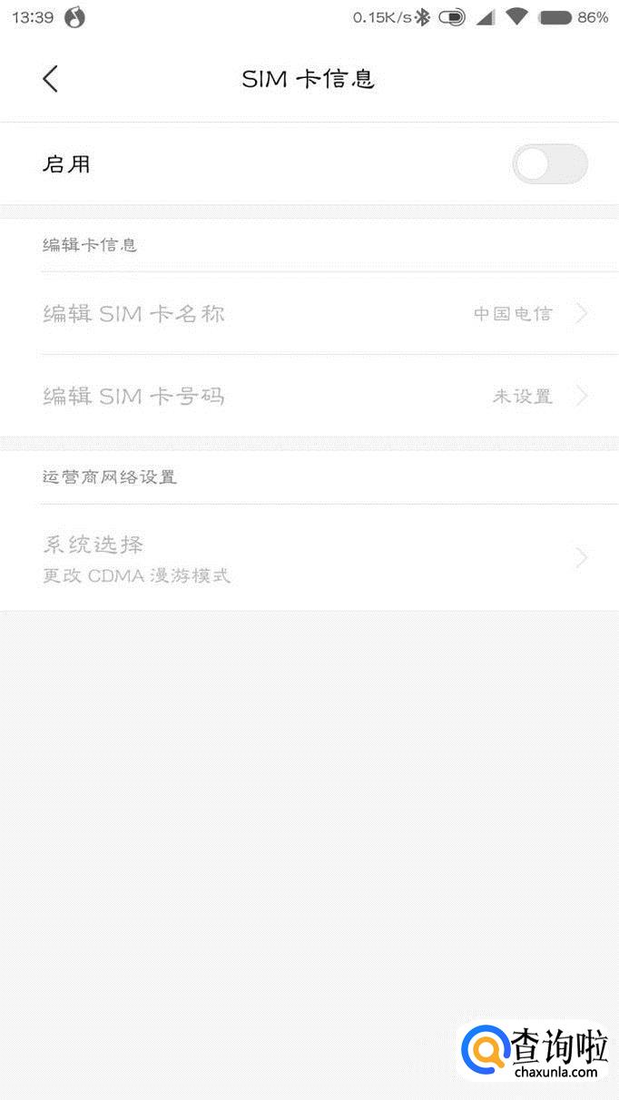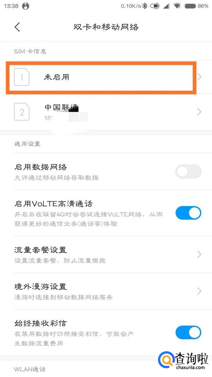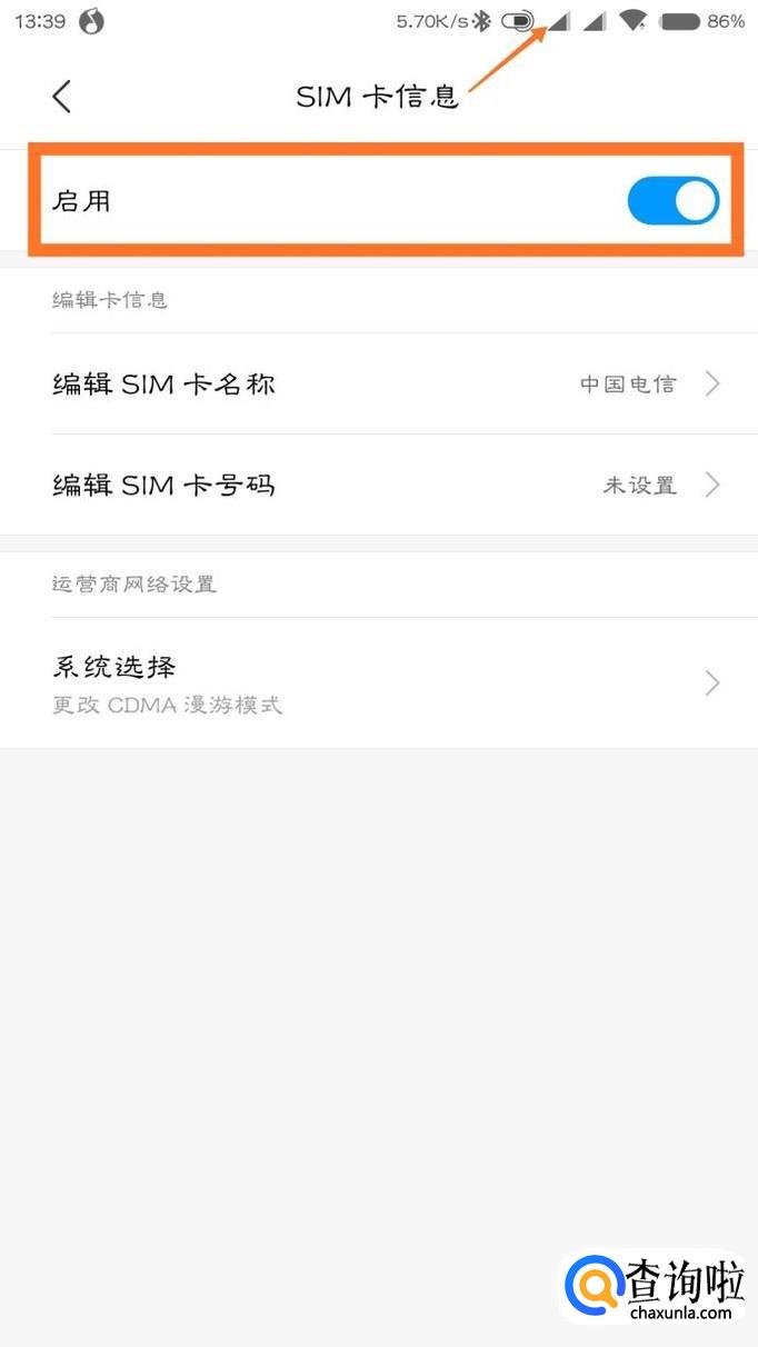 在这里我们可以看到我手机的卡1是没有启用的,信号树也是没有的,点击这张卡。