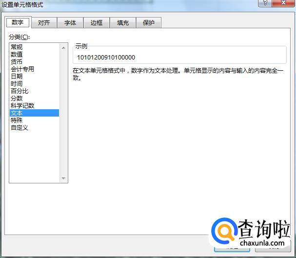 在打开的设置单元格格式窗口中,点击“数字”选项卡,然后在数字选项卡中从分类列表里选中“文本”,然后点击“确定”。