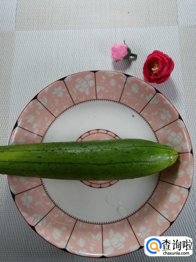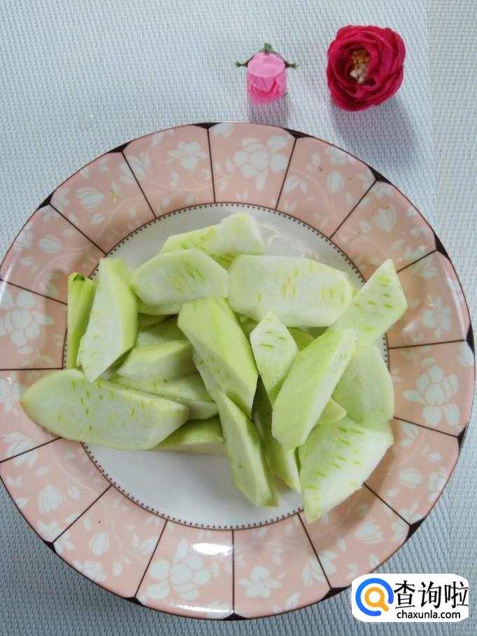 准备一个比较嫩的丝瓜,洗净去皮后切成滚刀块,放入盘中备用。