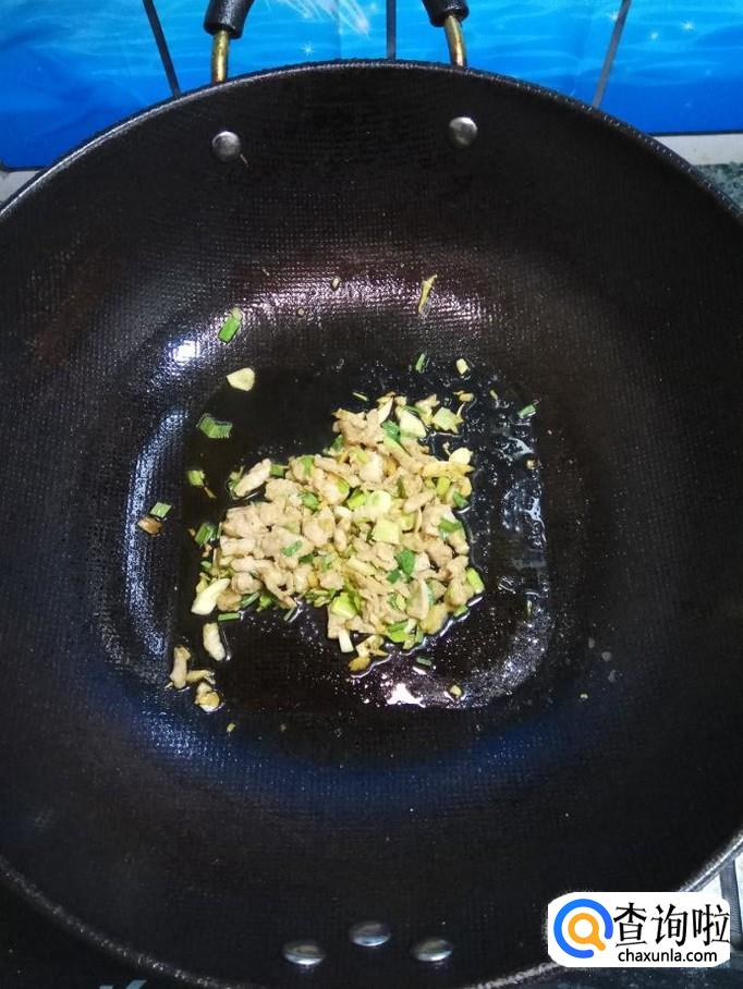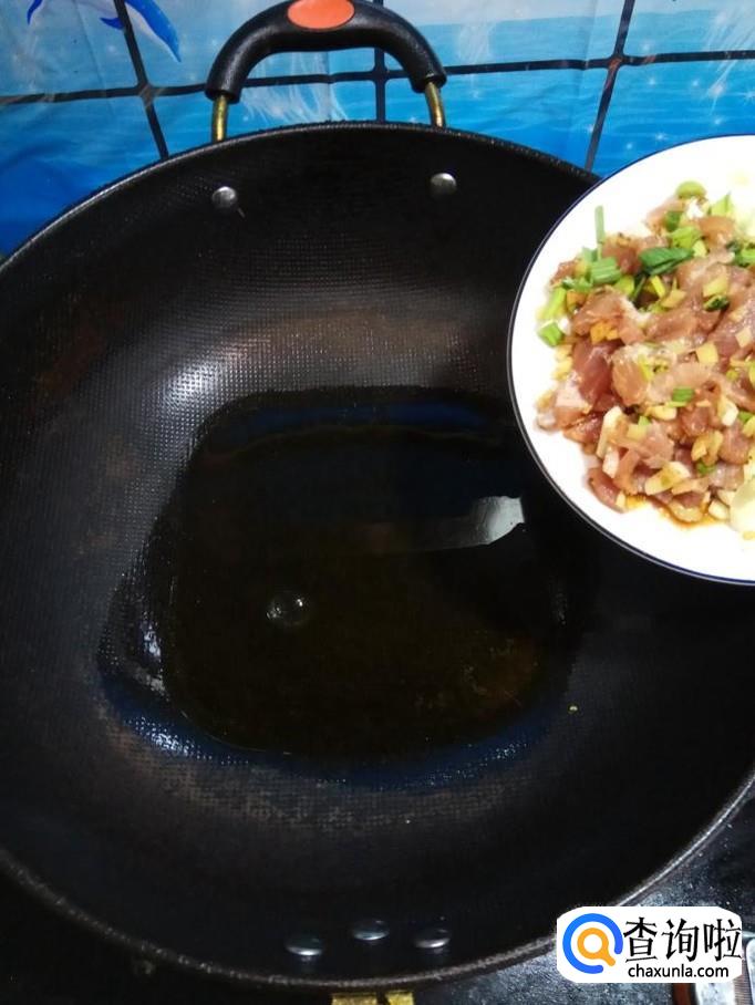 炒锅中放入适量油,油热后,将之前腌好的肉丝,放入锅中炒香。