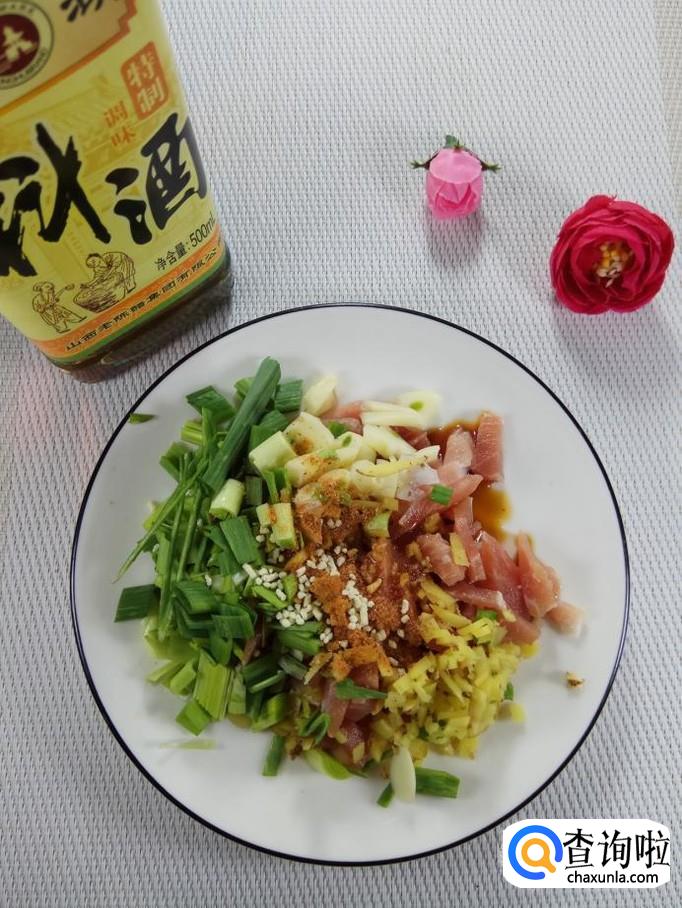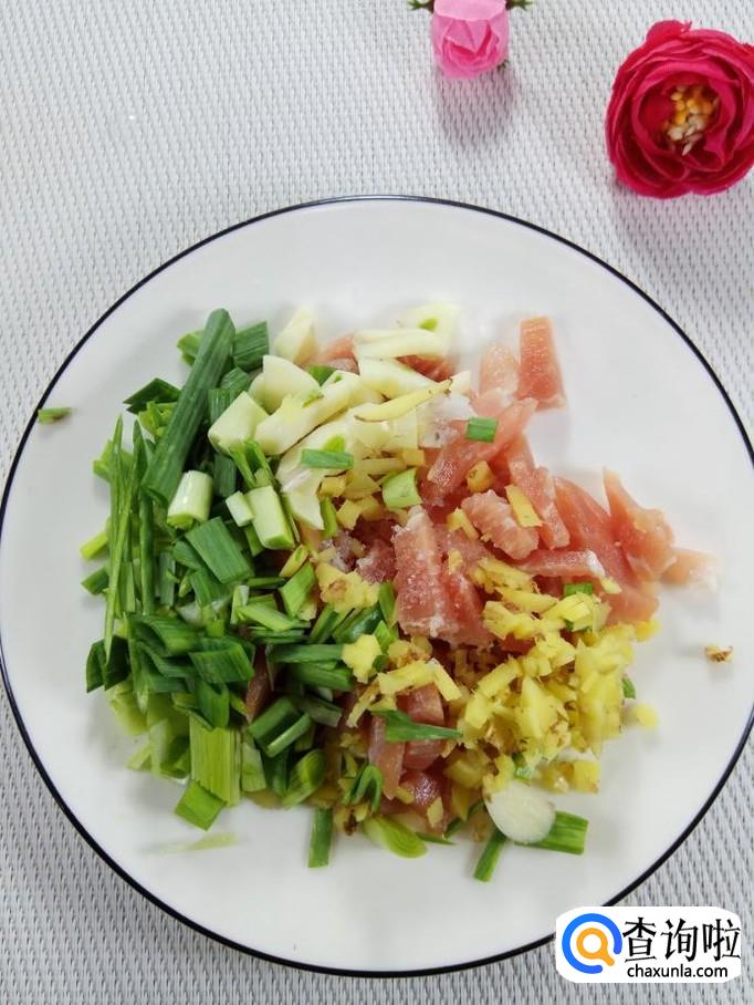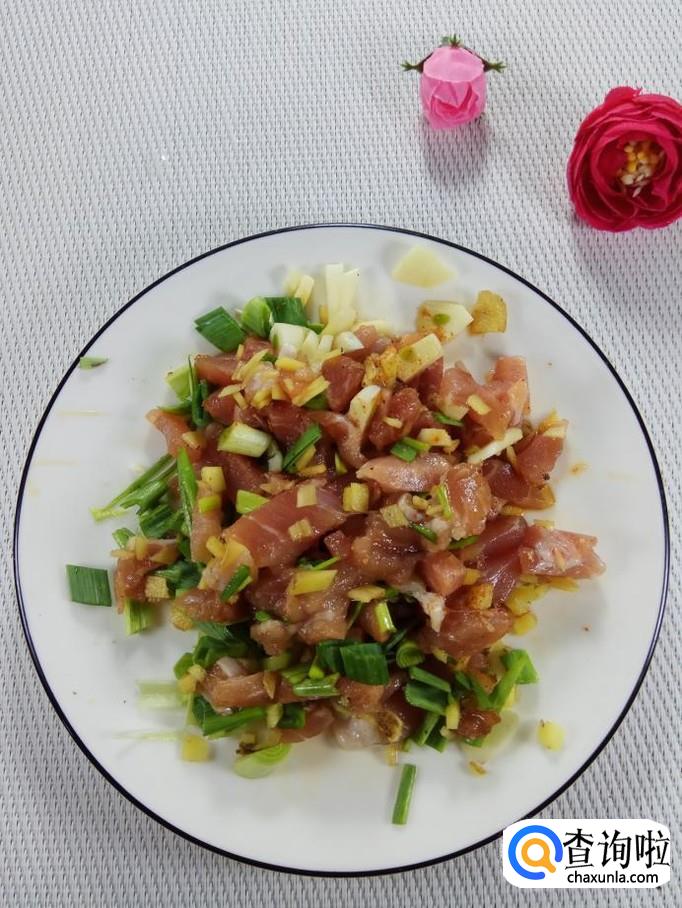 准备适量葱,姜,蒜,洗净后,将蒜切碎,葱切碎,蒜切片,和五花肉放在一起,放入适量盐,鸡精,五香粉,生抽,料酒,搅拌均匀,腌制15分钟。