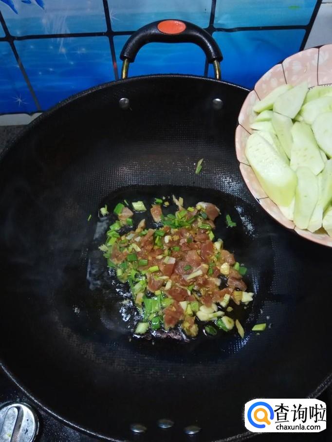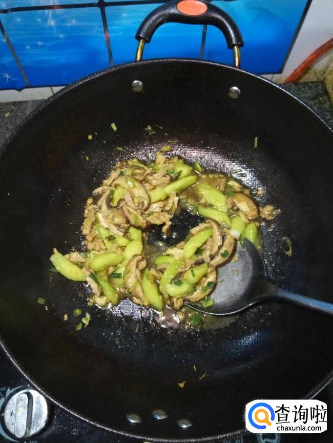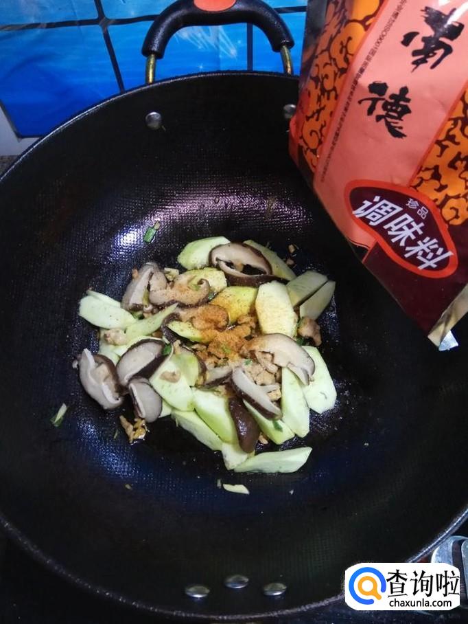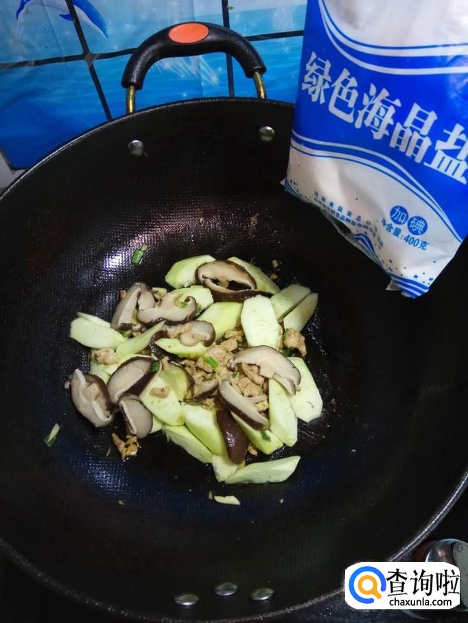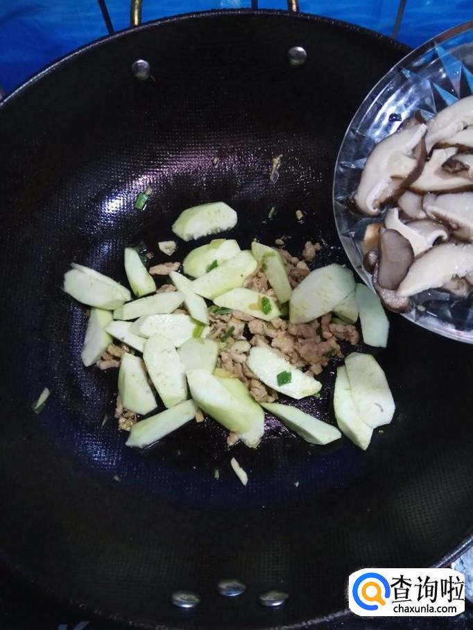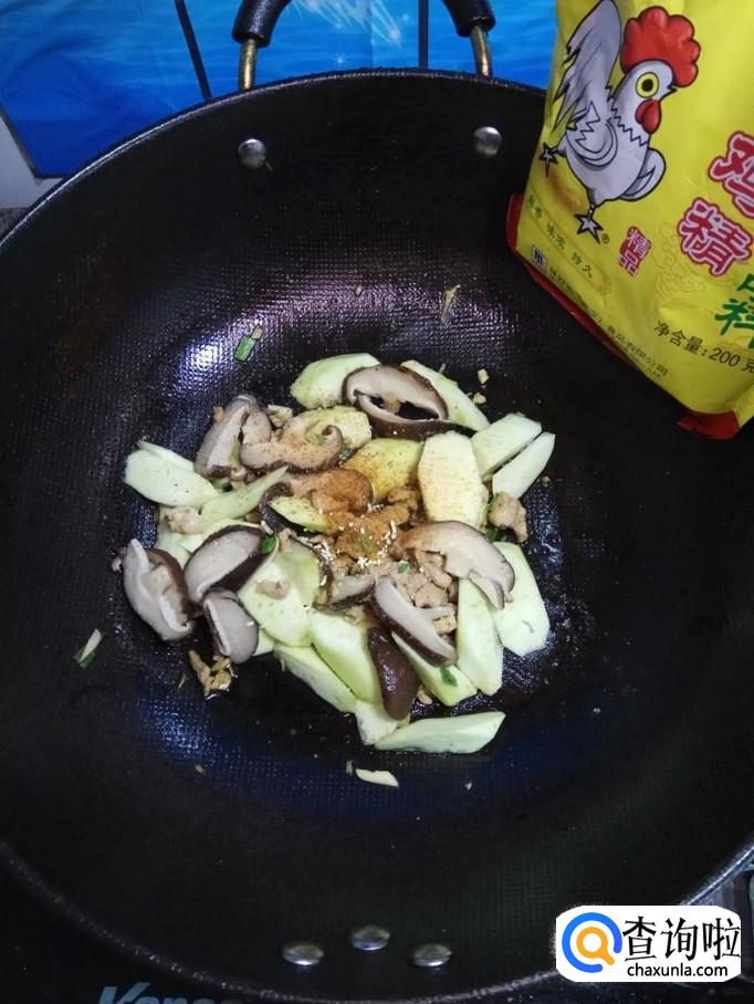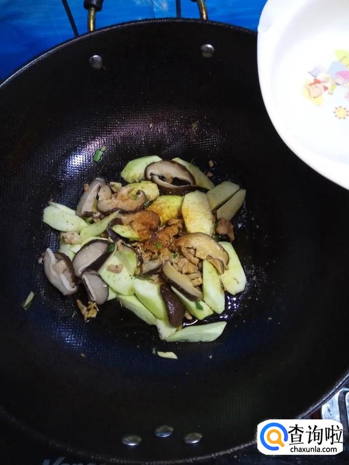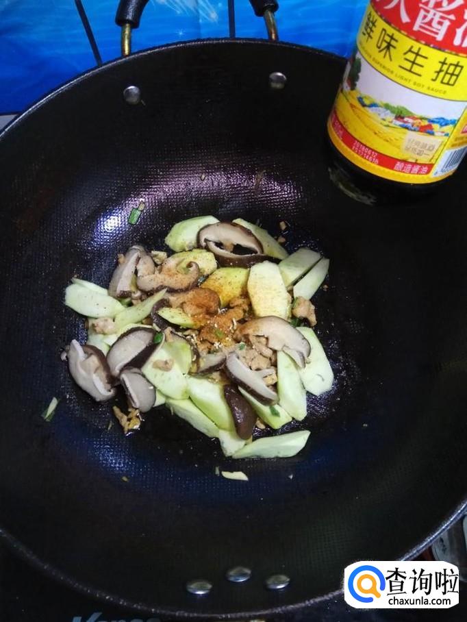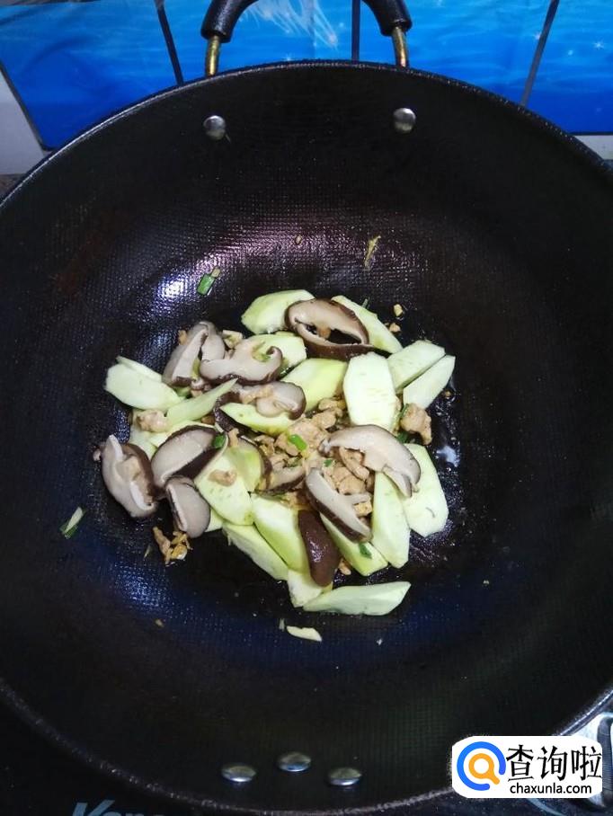 将丝瓜倒入锅中,翻炒均匀,然后将香菇也放入锅中,翻炒均匀。