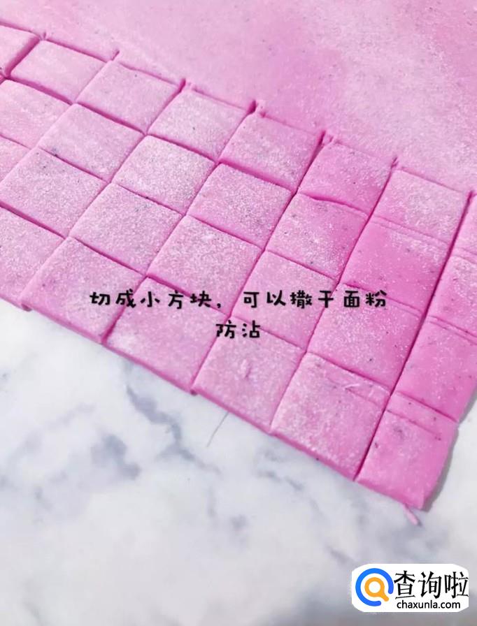 接着用刀切成小方块,如下图所示。小贴士:为了防止面团粘刀,大家可以在刀的表面和面饼的表面撒上面粉。