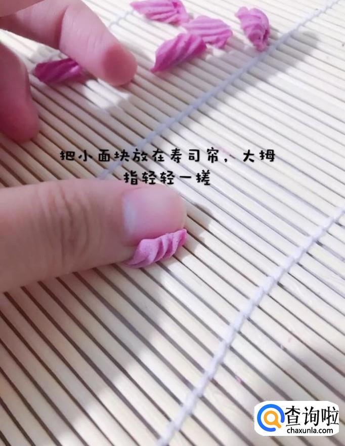 然后把切好的小面块放在寿司帘上,大拇指轻轻一搓就可以了。