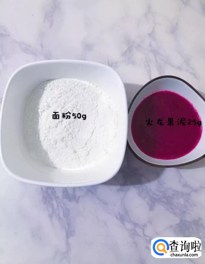 首先我们要准备50克的面粉和25克的火龙果泥,如下图所示。