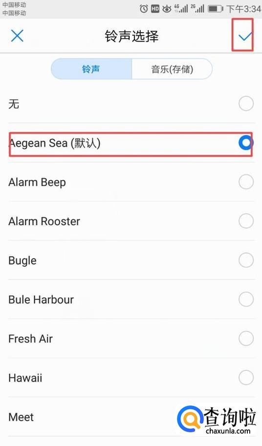 弹出的界面,我们可以看到很多铃声,此处我们选择默认的,然后点击右上角的勾选;