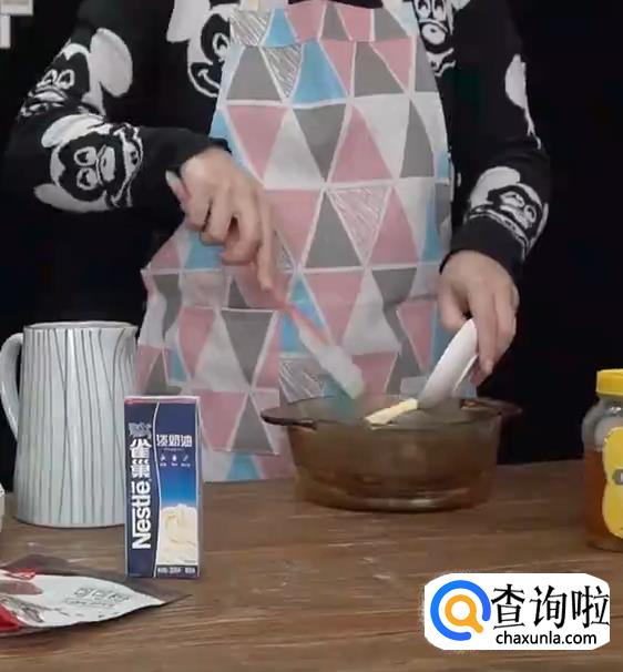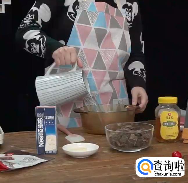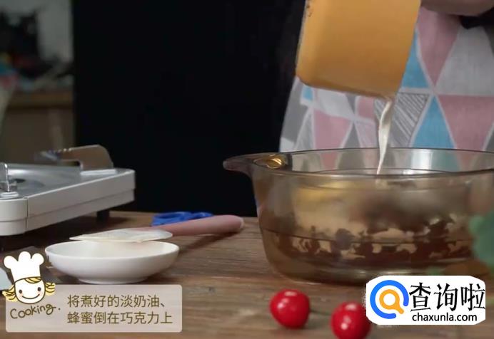 将煮好的淡奶油和蜂蜜倒在巧克力上。