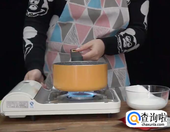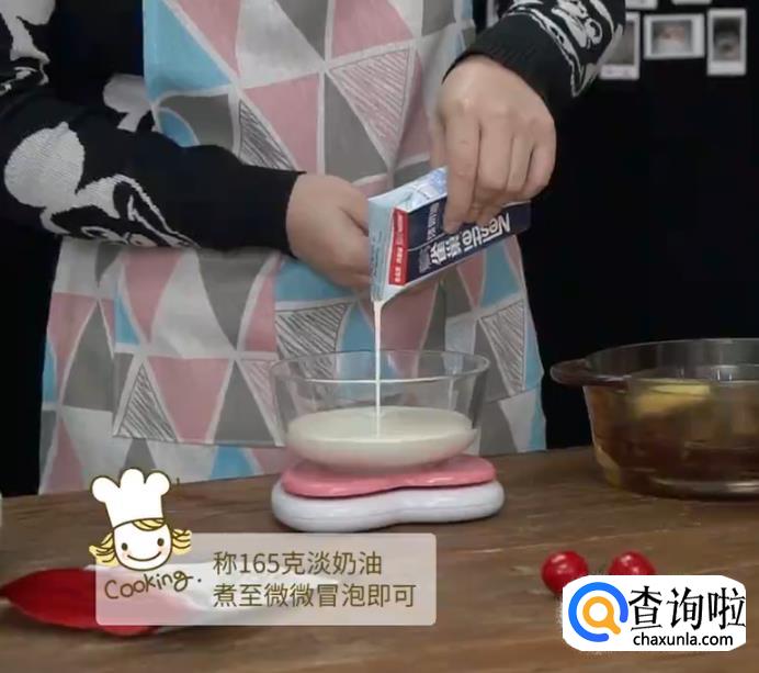 将淡奶油倒入锅中,煮至边缘微微冒泡。