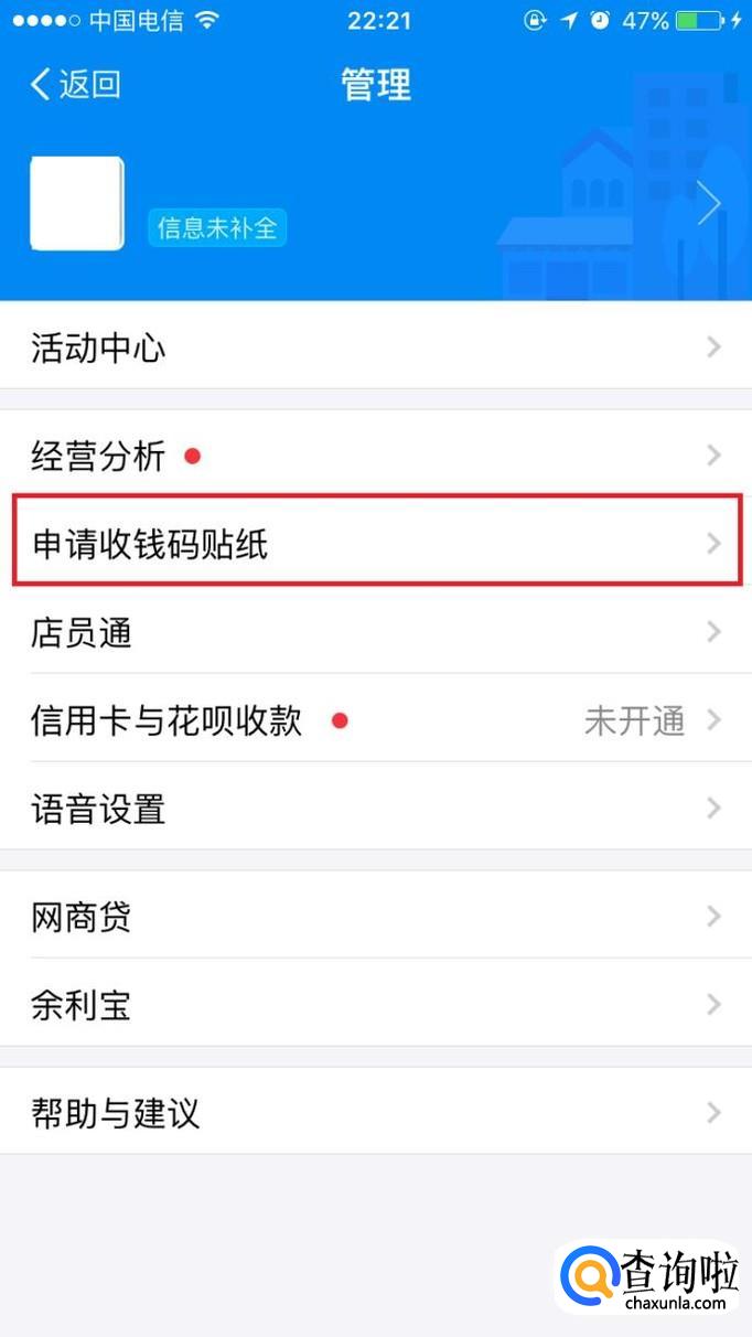 进入管理页面后点击“申请收款码贴纸”。