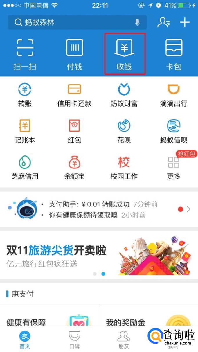 进入支付宝首页,点击“收钱”。
