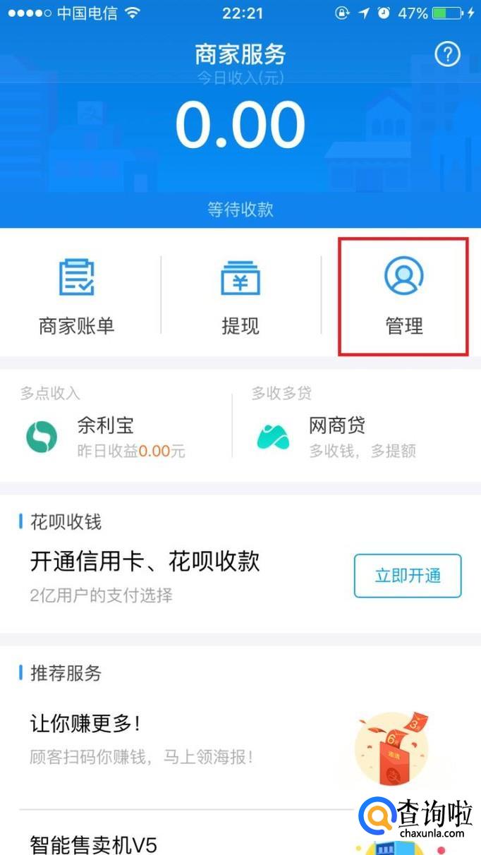 在商家服务页面点击“管理”。