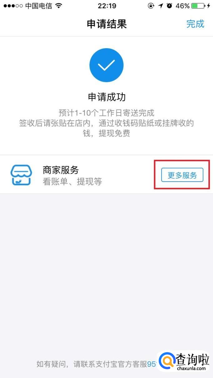 这时就申请成功啦,成功后支付宝将会用快递把刚刚申请的收款二维码寄过来,如果我们想要查看付款码的快递情况,点击“更多服务”。