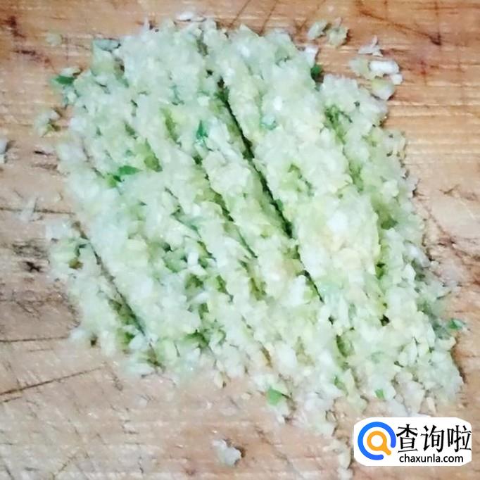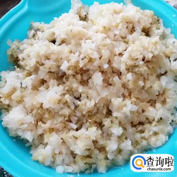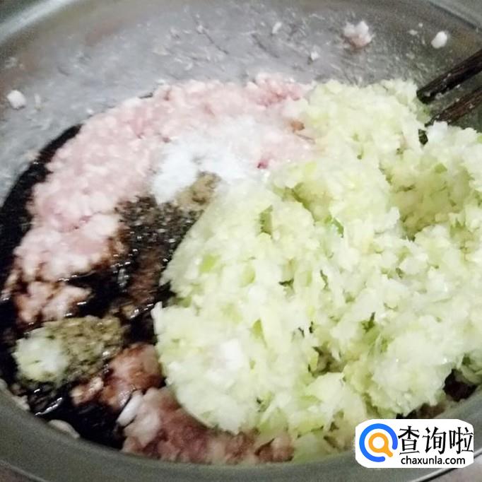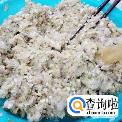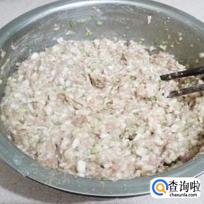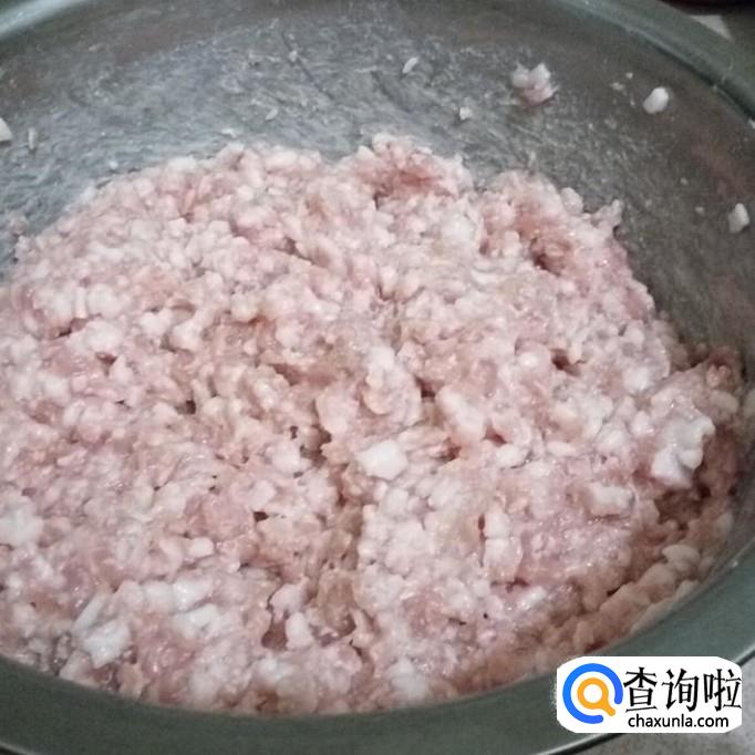 猪肉馅加适量水,顺着一个方向搅拌,使水融入到肉馅中。