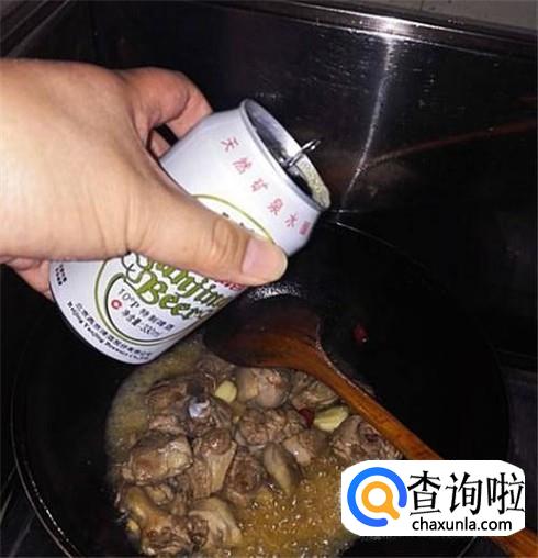 锅里放上一些油烧热,把鸭肉放进去慢慢翻炒,直到鸭肉炒的干干的,这时候加入生姜、葱段、八角,然后放入一些生抽和几块冰糖,翻炒几下倒入一罐啤酒,盖上盖子。