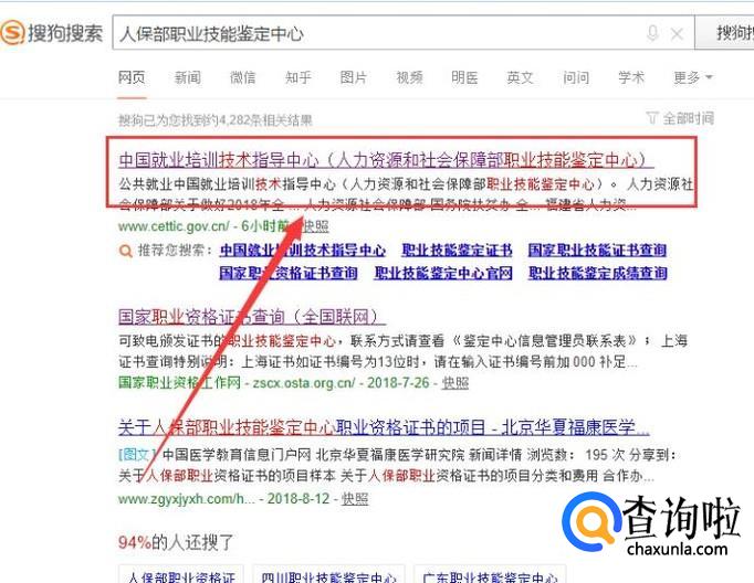 在搜索框中搜索“人保部职业技能鉴定中心”,点击官网链接,如图所示。