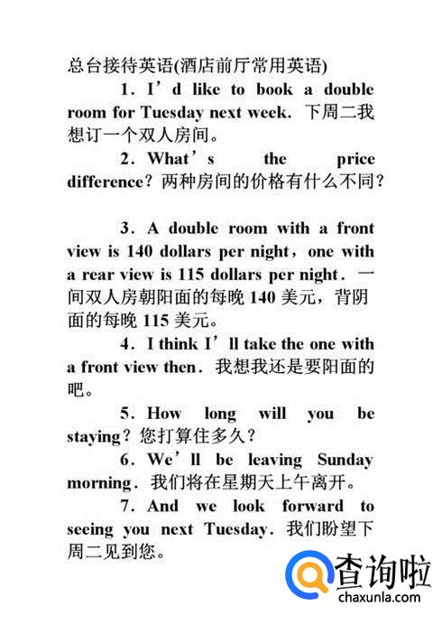 如果说问到房间的具体价格的时候,酒店前台的英语表达可以如下:The room is cheap,only 100 yuan one night.房间很便宜,只要100元一晚上。