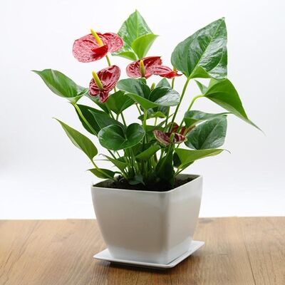 红掌的花朵比较的喜庆,花期很长,可以养在室内。吸收净化的功能也很强,可以吸收空气中的有害物质。并且它的象征意义也很好,放在家中看着,心情也会变得愉悦。不过要注意这种花含有轻微毒性,有小孩、孕妇、小宠物的尽量不要养,也不要放在卧室里面。