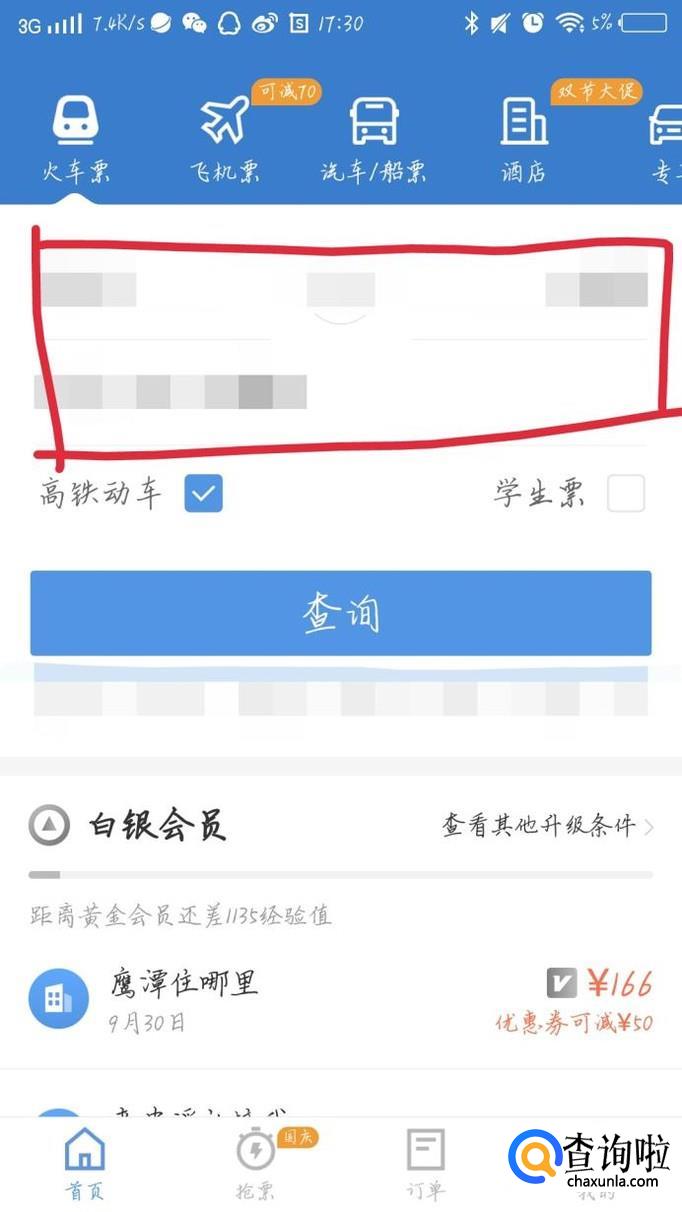 在如图1框框所示的区域输入你的出发地点和目的地还有出发时间。在如图2箭头所示的地方勾选高铁动车。