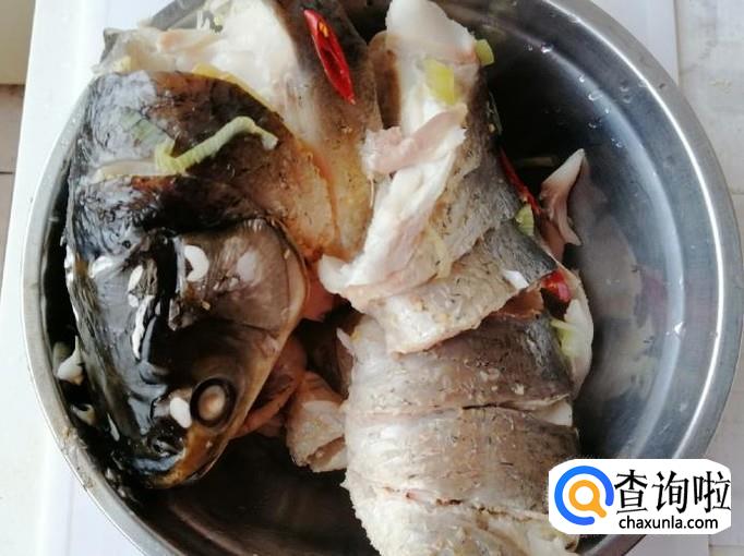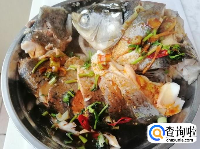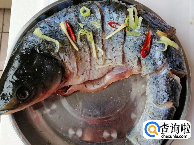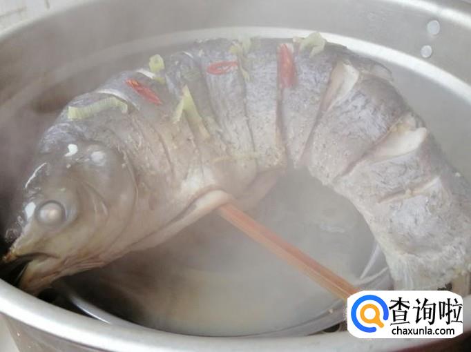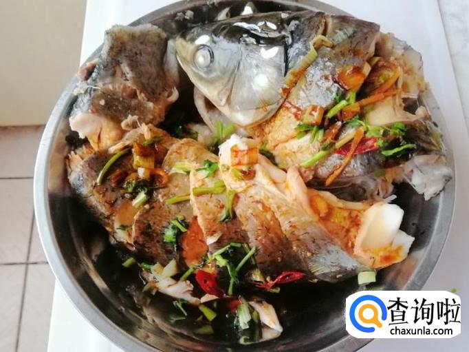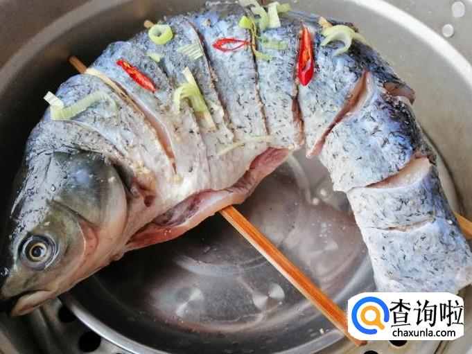 开锅上气后看时间,大约十五分钟后草鱼就蒸熟了,打开锅盖把蒸好的草鱼取出,滤掉容器中的水。