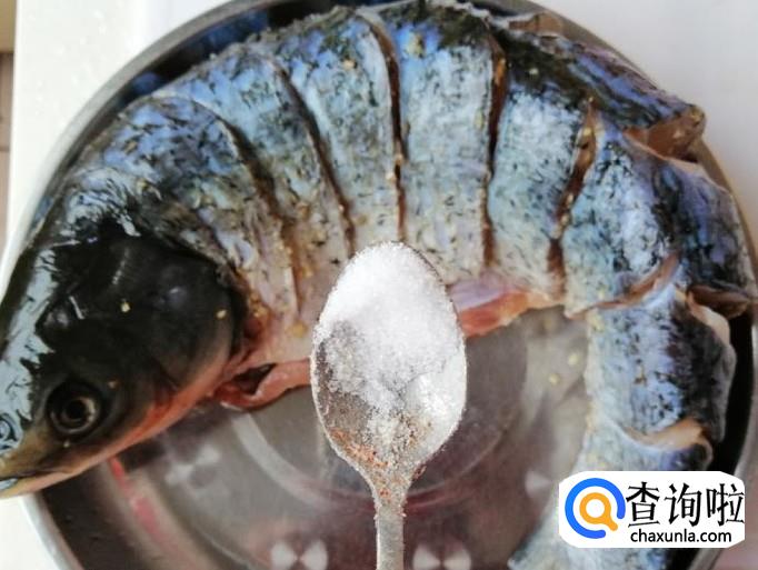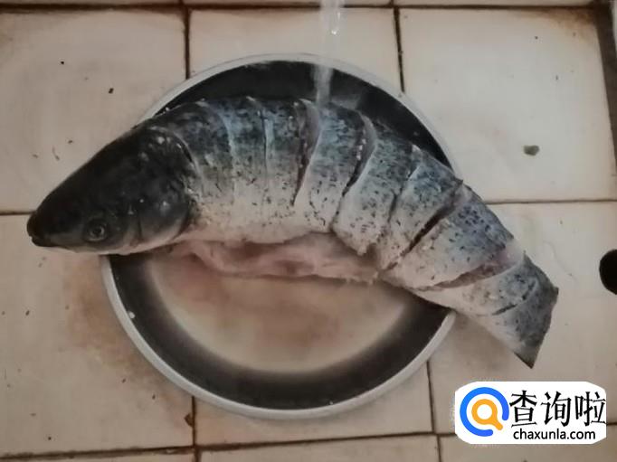 把洗好的草鱼放在菜板上,用刀在鱼身上划几刀,如图所示两面都划好,放入适量食盐和姜丝、葱花、料酒,把鱼腌制最少两小时。