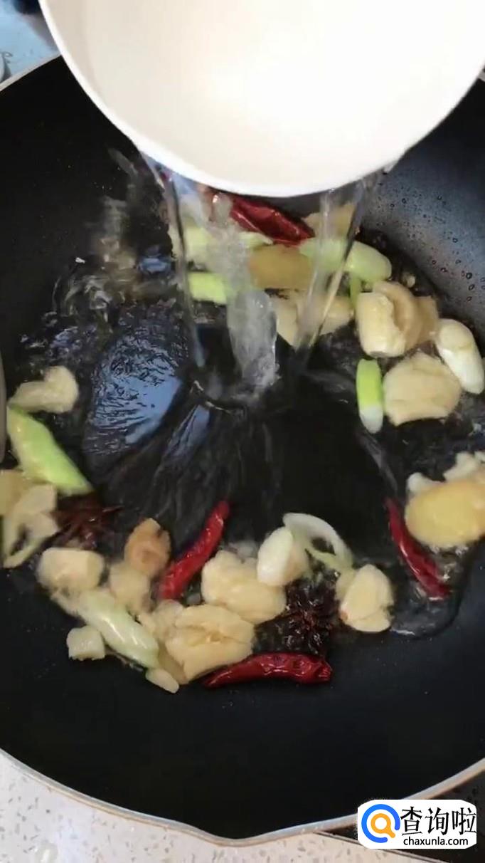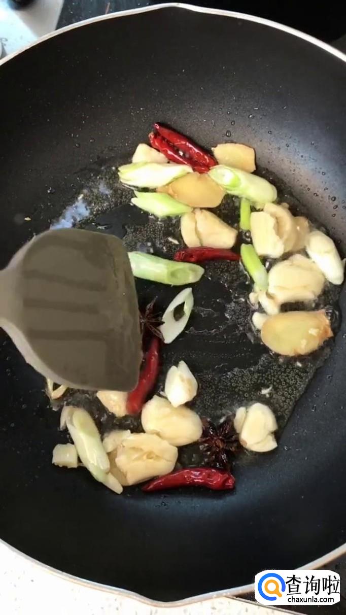 锅中放入适量的食用油,加入蒜头,干辣椒,大蒜和八角爆香,如下图所示。