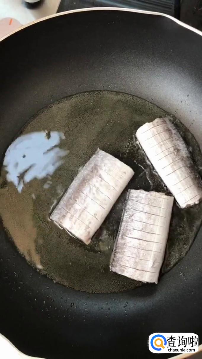 然后锅中放入适量的食用油,把带鱼放进去开小火煎五分钟,如下图所示。