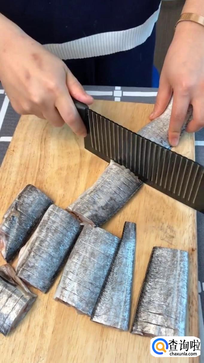首先将带鱼切成长约3cm的段,如下图所示。在切带鱼之前,大家一定要注意把带鱼的肚子破开并清洗干净。