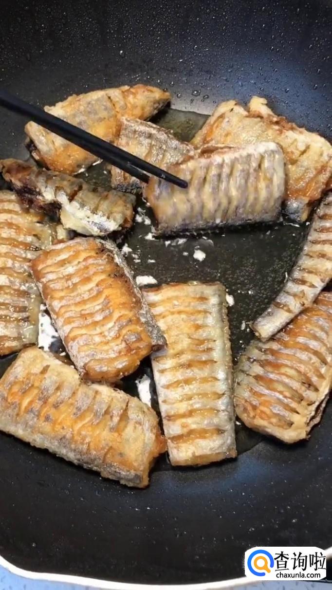 在煎带鱼过程中,要用筷子不断翻动一下带鱼,避免带鱼粘锅。其实煎过的带鱼皮味道还是不错的。
