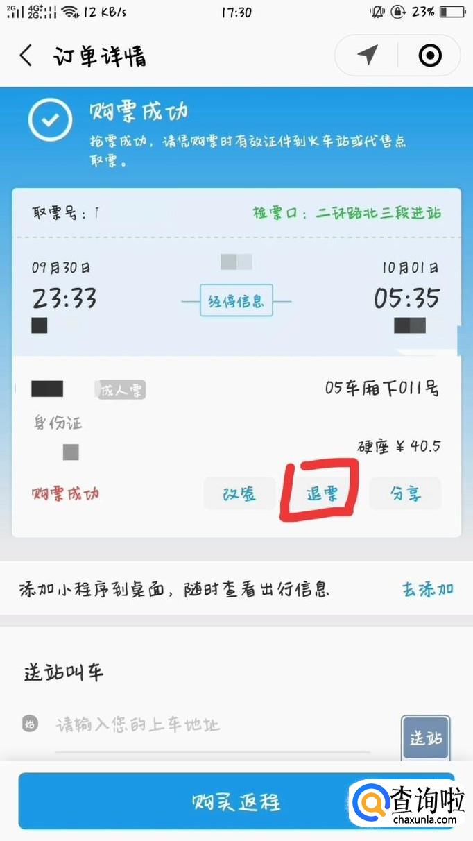 显示出具体信息后,点击车票下方的退票选项,进行退票。