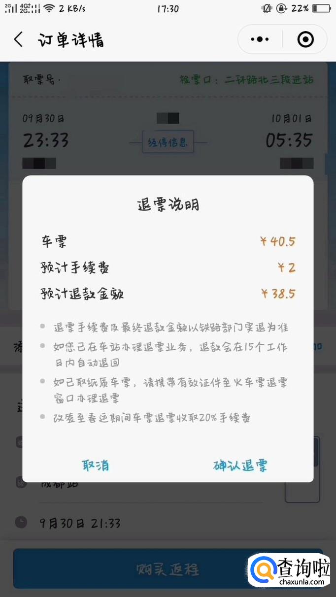 点击退票后,平台会收一定的手续费,并且越接近乘车日期,手续费越贵。