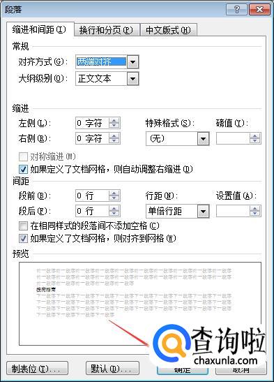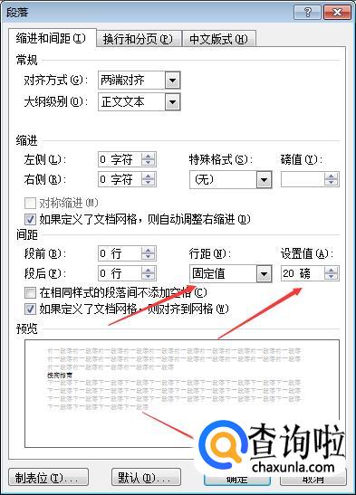 在弹出的界面里面找到行距,把它设置成“固定值”,然后在“设置值”下面输入自己想要的间距,如下图输入的就是“20磅”,最后点击下面的“确定”后删掉刚刚插入的回车符就可以了。