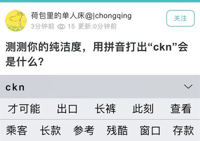 ckn测纯洁度是指在手机或电脑的输入法中,打下ckn这3个字母,看打出的是哪三个字。因为输入法会记录用户输入习惯,用输入法打这三个字母就可以看出用户日常的浏览偏好了,不纯洁的用户就会出现让人脸红的词。