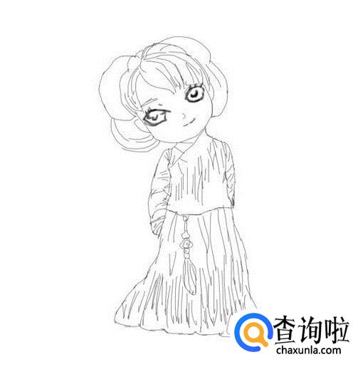 最后再在身体下面画出裙子,然后再画出裙子上面的吊坠,并再画出衣服上面的褶皱线,这样Q版古装女就画好了,如图所示: