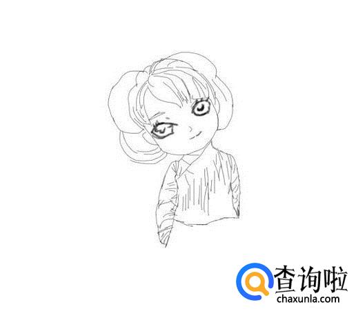 再在头部下面画出女孩的身体及两只胳膊,然后再身体上画出衣服细节,如图所示: