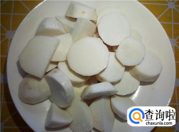 毛芋头削皮,清洗干净,切成薄片。