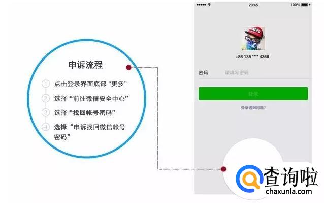 点击登录界面底部“更多”->前往微信安全中心->找回帐号密码->申诉找回微信帐号密码。