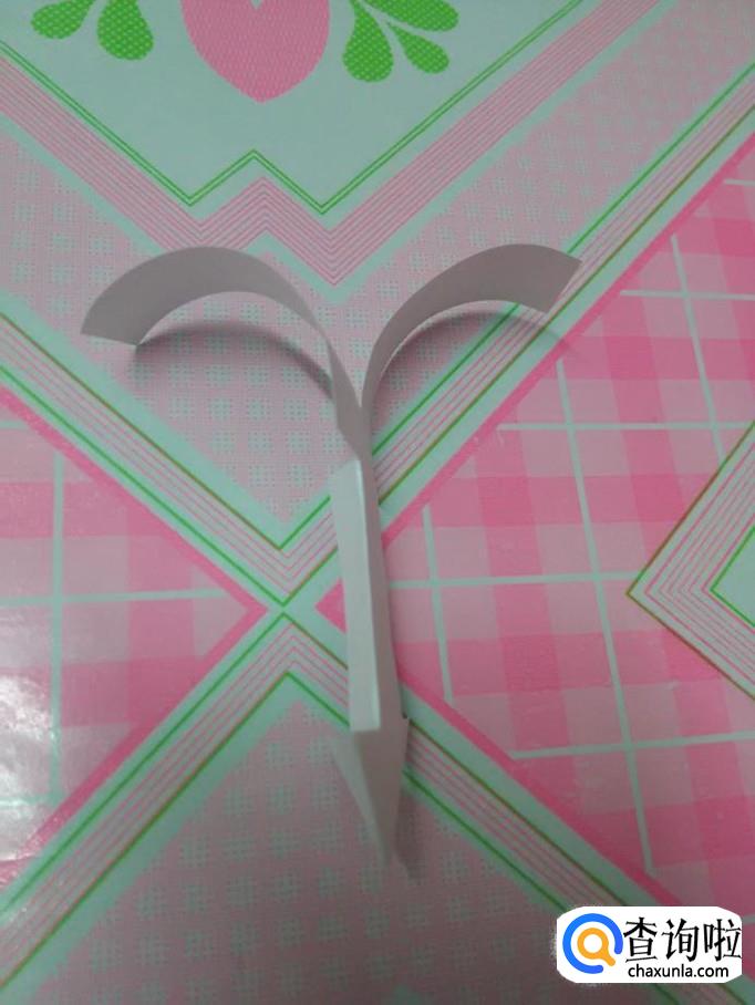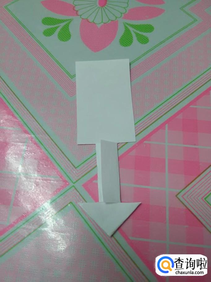 用剪刀把三角形上方左右两边各剪开三分之一的宽度,然后把两边往中间折,折成一个细细的脖子状。