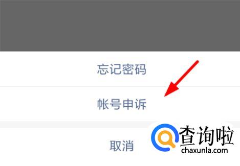 点击了“登录遇到问题了”这个选项之后,我们就会看到一个弹窗菜单,包括了“忘记密码”、“账号申诉”、“取消”三个选项,我们点击“账号申诉”;