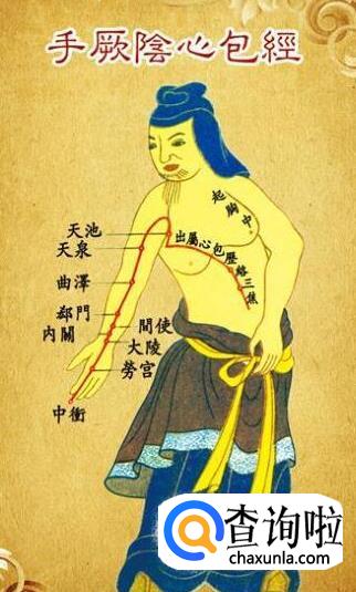 第九张图是【手闕阴心包经图】其口诀为:九穴心包手厥阴,天池天泉曲泽深,隙门间使内关对,大陵劳宫中冲寻。