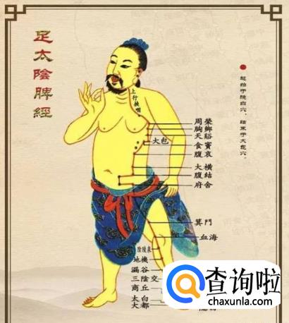 第四张图是【足太阴脾经图】。口诀为:足太阴脾由足拇,隐白先从内侧起,大都太白继公孙,商丘直上三阴交,漏谷地机阴陵泉,血海箕门冲门前,府舍腹结大横上,腹哀食窦天溪连,胸乡周荣大包尽,二十一穴太阴全。
