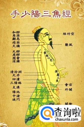 第十张图是【手少阳三焦经图】其口诀为:二十三穴手少阳,关冲液门中褚旁,阳池外关支沟正,会宗三阳四渎长,天井清冷渊消烁,臑会肩髎天髎堂,天牖翳风瘈脉青,颅息角孙耳门乡,禾髎前接丝竹空,三焦经穴此推详。