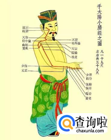 第六章图是【手太阳小肠经图】。其口诀为:手太阳经小肠穴,少泽先行小指末,前谷后溪腕骨间,阳谷须同养老列,支正小海上肩贞,臑俞天宗秉风合,曲垣肩外复肩中,天窗循次上天容,此经穴数一十九,还有颧髎入听宫。