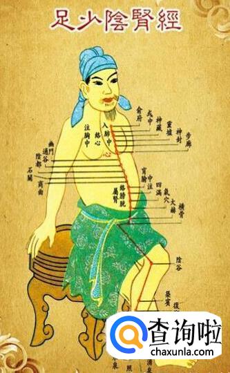 第八张图是【足少阴肾经图】其口诀为:足少阴穴二十七,涌泉然谷太溪益,大钟水泉通照海,复溜交信筑宾宜,阴谷漆内辅骨后,以上从足走至膝,横骨大赫连气穴,四满中注盲腧集,商曲石关阴都密,通谷幽门半寸毕,步廊神封又灵墟,神藏或中俞府毕。